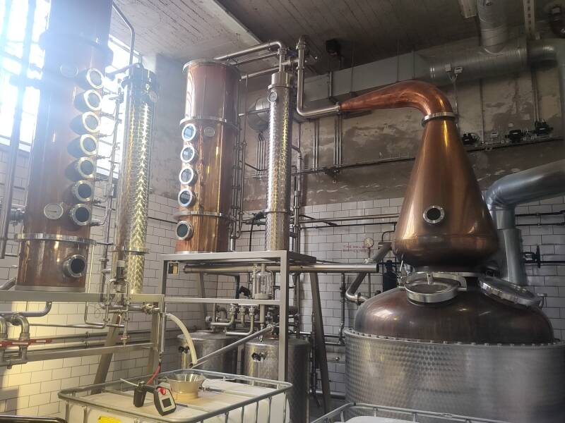 HDC uses pot stills with optional columns attached, all fitted into quite a small space. While this isn’t a craft distillery doing long fermentations like Naguelann, they do emphasize a lighter cut of spirit, and they use a few plates in these attached columns when running rye spirit through the stills.